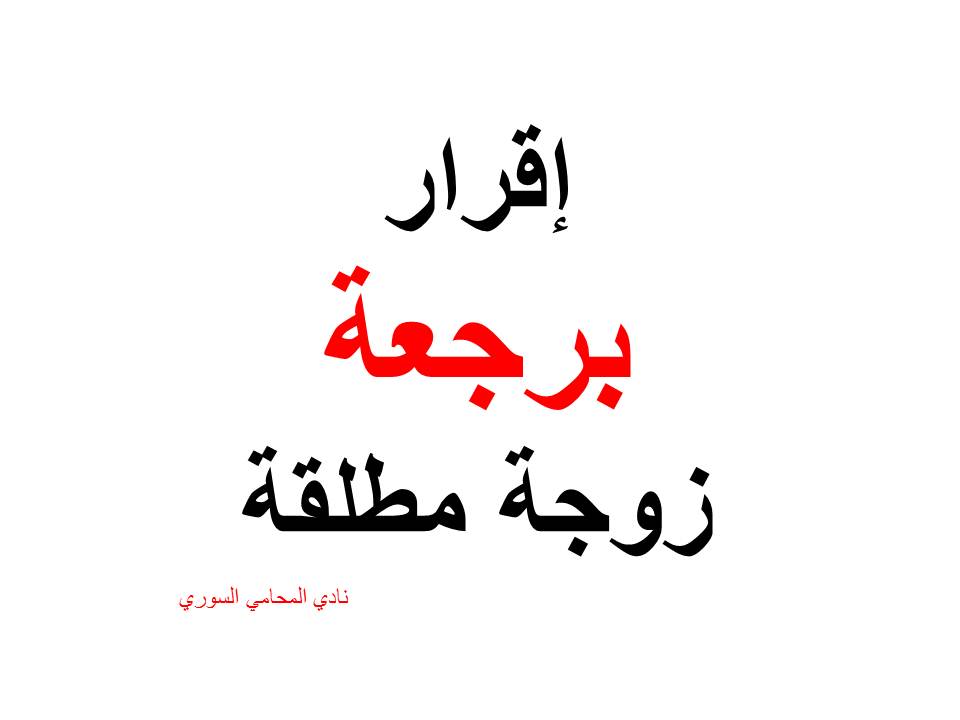إقرار برجعة زوجة مطلقة أنا الموقع أدناه …… بن …… والدتي …… تولد …… 19 …… خ …… أحمل البطاقة الشخصية الصادرة عن أمين السجل المدني في …… رقم … /… تاريخ   /  / أقر وأنا بكامل الأهلية المعتبرة شرعاً وقانوناً بأني كنت طلقت زوجتي السيدة …… بنت …… والدتها …… بتاريخ /  / طلقة