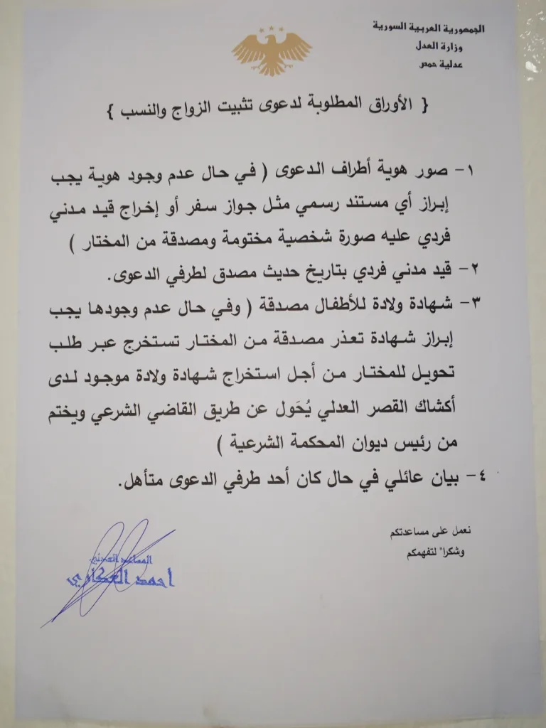 ا { الأوراق المطلوبة لدعوى تثبيت الزواج والنسب } -١- صور هوية أطراف الدعوى ) في حال عدم وجود هوية يجب إبراز أي مستند رسمي مثل جواز سفر أو إخراج قيد مدني فردي عليه صورة شخصية مختومة ومصدقة من المختار ) ۲- قيد مدني فردي بتاريخ حديث مصدق لطرفي الدعوى. ٣- شهادة ولادة للأطفال مصدقة